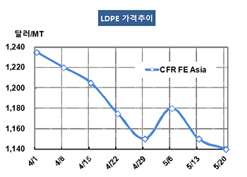 LDPE(Low-Density Polyethylene)는 하락세를 지속하고 있다. LDPE 가격은 5월18일 CFR FE Asia 톤당 1140달러로 10달러 하락했고 CFR SE Asia 역시 1160달러로 10달러 떨어졌다. 표, 그래프 : < LDPE 가격추이> <화학저널 2016/05/23> |