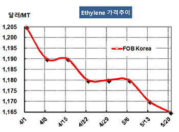 에틸렌(Ethylene)은 하락세를 지속하고 있다. 에틸렌 가격은 5월20일 FOB Korea 톤당 1165달러로 5달러 하락했고 CFR SE Asia도 1135달러로 5달러 떨어졌다. CFR NE Asia는 1170달러로 10달러 하락했다. 표, 그래프 : < Ethylene 가격추이> <화학저널 2016/05/23> |