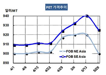 아시아 PET(Polyethylene Terephthalate) 시장은 하락세로 전환됐다.