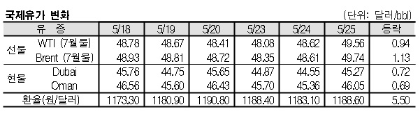 5월25일 국제유가는 미국의 원유 재고 및 생산량 감소, 주요국 증시 강세로 상승했다. 5월25일 국제유가는 미국의 원유 재고가 감소하면서 상승했다. 표, 그래프: <국제유가 변화> <화학저널 2016/05/26> |