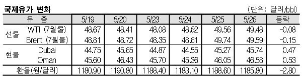 5월26일 국제유가는 원유 공급 증가, 석유수출국기구(OPEC)의 생산 목표 합의 불투명 등으로 하락했다. 5월26일 국제유가는 원유 공급이 증가할 것이라는 예측이 확산되면서 하락했다. 표, 그래프: <국제유가 변화> <화학저널 2016/05/27> |