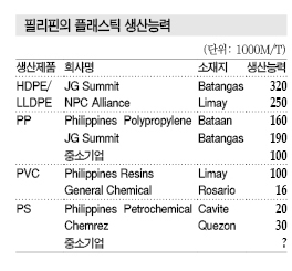 JG Summit이 Batangas에서 유일한 에틸렌(Ethylene) 크래커를 가동하고 있으나 가동률이 80-90%에 불과하고 유도제품인 PO(Polyolefin)는 중국산 유입 및 밀수로 가동률이 80% 미만에 그치고 있다.