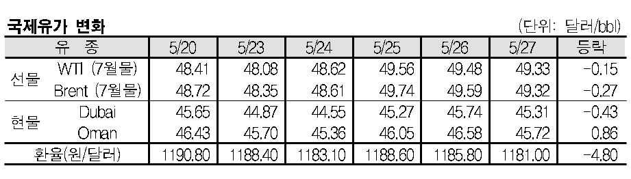 5월27일 국제유가는 미국 달러화 강세 및 원유가격 상승에 따른 생산 증가 우려 등으로 하락했다. 5월27일 국제유가는 미국 달러화 강세로 하락했다. 표, 그래프: <국제유가 변화> <화학저널 2016/05/30> |