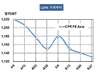 LDPE(Low-Density Polyethylene)는 하락세가 멈추지 않고 있다. LDPE 가격은 5월25일 CFR FE Asia 톤당 1130달러로 10달러 하락했으나 CFR SE Asia는 1160달러로 변동이 없었다. 표, 그래프 : < LDPE 가격추이 > <화학저널 2016/05/30> |