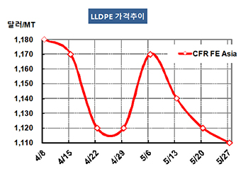 LLDPE(Linear Low-Density Polyethylene)는 하락세가 멈추지 않고 있다. LLDPE 가격은 5월25일 부텐(Butene) 그레이드 기준 CFR FE Asia 톤당 1130달러로 10달러 하락했고 CFR SE Asia도 1140달러로 10달러 떨어졌다. 표, 그래프 : < LLDPE 가격추이> <화학저널 2016/05/30> |