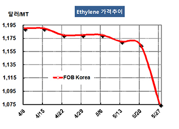 에틸렌(Ethylene)은 갑자기 폭락세로 전환됐다. 에틸렌 가격은 5월27일 FOB Korea 톤당 1075달러로 90달러 폭락했고 CFR SE Asia도 1065달러로 70달러 떨어졌다. CFR NE Asia도 1100달러로 70달러 폭락했으나 FOB Korea와의 스프레드는 20달러 좁혀졌다. 표, 그래프 : < Ethylene 가격추이 > <화학저널 2016/05/30> |