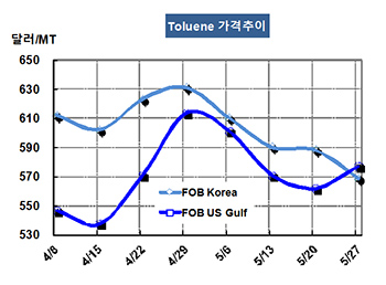 톨루엔(Toluene)은 하락세가 가속화되고 있다. 톨루엔 가격은 5월27일 FOB Korea 톤당 569달러로 19달러 하락했고 CFR SE Asia 역시 608달러로 15달러 떨어졌다. CFR India는 638달러로 20달러 하락했다. 표, 그래프 : < Toluene 가격추이 > <화학저널 2016/06/01> |
