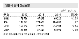 2014년 MEK 생산량은 21만4598톤으로 일본기업 3사가 정기보수를 실시함에 따라 3년 만에 감소세로 전환했다. 수출도 생산이 줄어든 가운데 내수를 우선시함에 따라 10만305톤으로 감소했다.