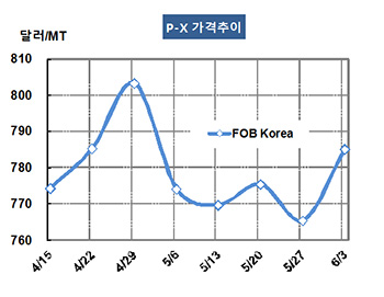 P-X 가격은 6월3일 FOB Korea 톤당 785달러로 20달러 상승했고 CFR SE Asia도 803달러로 20달러 올랐다.