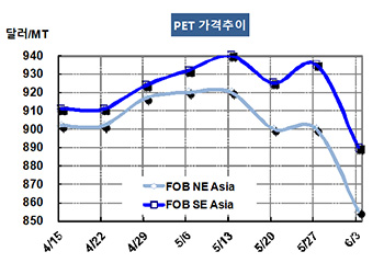 PET 칩 가격은 Bottle 그레이드 기준 6월3일 FOB NE Asia 톤당 855달러로 45달러 폭락했고 FOB SE Asia도 890달러로 45달러 떨어졌다.