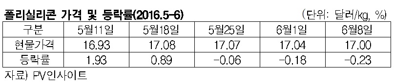 표, 그래프: <폴리실리콘 가격 및 등락률> <화학저널 2016/06/09> |