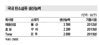 국내 탄소소유 생산능력은 효성이 2200톤, 태광산업이 1500톤으로 나타나고 있으나 가동률은 50-60% 이하이며, 수율도 50% 미만으로 추정되고 있다.