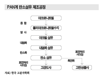 PAN계 탄소섬유는 아크릴섬유(Acrylic Fiber)를 300℃ 이상에서 탄화해 생산하며 무게는 철보다 4분의 1에 불과한 반면 강도는 10배가 넘고 탄성률은 7배에 달해 경량화 소재로 주목받고 있다.