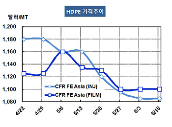 HDPE(High-Density Polyethylene)는 변동성이 잠잠해진 가운데 일부만 상승했다. HDPE 가격은 6월8일 Injection 그레이드 기준 CFR FE Asia 톤당 1085달러로 보합세를, CFR SE Asia 역시 1105달러, CFR S Asia는 1125달러로 변동이 없었다. 표, 그래프 : < HDPE 가격추이 > <화학저널 2016/06/13> |