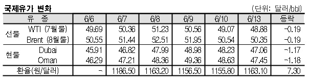 6월13일 국제유가는 브렉시트(Brexit) 우려에 따른 주요국 증시 하락, 중국 경기지표 악화 등으로 하락했다. 6월13일 국제유가는 주요국 증시가 일제히 약세를 나타내며 하락했다. 표, 그래프: <국제유가 변화> <화학저널 2016/06/14> |