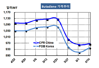 부타디엔(Butadiene)은 급락에 대한 반발로 급등했다. 부타디엔 가격은 6월10일 FOB Korea 톤당 940달러로 30달러 급등했으나 CFR SE Asia는 920달러로 5달러 상승에 그쳤다. CFR China 역시 965달러로 5달러 올랐다. 표, 그래프 : < Butadiene 가격추이> <화학저널 2016/06/14> |