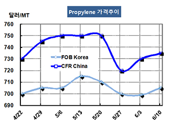 프로필렌 가격은 6월10일 FOB Korea 톤당 705달러로 6달러 상승했고 CFR SE Asia는 700달러로 변동이 없었다. CFR China는 735달러로 5달러 올랐다.