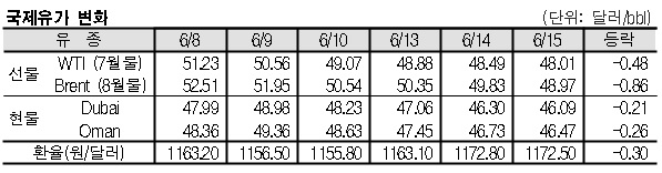 6월15일 국제유가는 캐나다 생산이 회복되면서 하락했다. 캐나다 Suncor Energy 등 일부 석유기업들은 오일샌드 생산을 재개한 것으로 나타났다. 표, 그래프: <국제유가 변화> <화학저널 2016/06/16> |