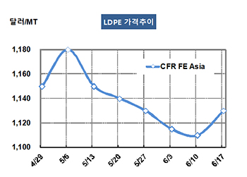 LDPE(Low-Density Polyethylene)는 오랜만에 상승세로 전환됐다. LDPE 가격은 6월15일 CFR FE Asia 톤당 1130달러로 20달러 상승했고 CFR SE Asia도 1140달러로 10달러 떨어졌다. 표, 그래프 : < LDPE 가격추이 > <화학저널 2016/06/20> |