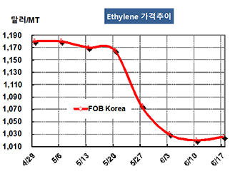 에틸렌(Ethylene)은 상승과 하락이 엇갈렸다. 에틸렌 가격은 6월17일 FOB Korea 톤당 1025달러로 5달러 상승했으나 CFR SE Asia는 1040달러로 5달러 하락했다. 표, 그래프 : < Ethylene 가격추이 > <화학저널 2016/06/20> |