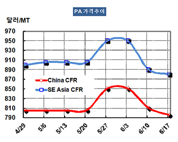 NBA(Normal Butyl Alcohol)은 판매지수가 떨어진 가운데 중국에서 수요가 상당했으나 높은 원료가격으로 인해 거래가 감소한 것으로 파악된다. ![]() NBA 가격은 CFR China 톤당 615달러, CFR SE Asia 625달러로 각각 15달러씩 떨어졌다. 2-EH(2-Ethyl Hexanol)는 다운스트림 DOP 수요가 부진함에 따라 CFR China 톤당 770달러, CFR SE Asia는 810달러로 각각 20달러 떨어졌다. 2-EH는 7월 물량에 대한 거래가 본격화되지 못하고 있으나 공급기업이 제시한 가격과 바이어들이 원하는 가격의 차이가 톤당 20달러에 불과해 거래가 증가할 것으로 예상되고 있다. DOP(Dioctyl Phthalate)는 수요가 약세를 지속해 CFR China 톤당 830달러, CFR SE Asia 톤당 950달러로 각각 10달러씩 떨어졌다. 시장 관계자는 “DOP는 중국 G20 정상회담을 앞두고 가동중단 플랜트가 발생한 것으로 알려져 2016년 7월에도 거래가 약세를 지속할 것”이라고 예상했다. 중국 정부는 가소제 공장들에게 2016년 6월 초부터 7월 말까지 가동중단할 것을 요구함에 따라 2-EH 및 PA(Phthalic Anhydride) 가격도 약세를 나타나고 있다. 중국 DOP 평균 가동률이 33% 수준으로 저조한 상태이나 2016년 9월부터 40-50%까지 회복할 것으로 예상돼 수요가 증가할 것으로 기대하고 있다. PA는 다운스트림 DOP 시장이 침체됨에 따라 하락세를 지속해 CFR China 톤당 795달러로 15달러 하락했으며 CFR SE Asia도 톤당 880달러로 10달러 떨어졌다. <정현섭 기자> 표, 그래프 : < PA 가격추이 > <화학저널 2016/06/24> |