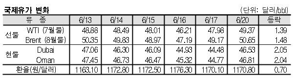 6월20일 국제유가는 브렉시트(Brexit) 우려 완화에 따른 미국 달러화 약세 및 주요국 증시 강세, 미국 쿠싱지역 원유 재고 감소 등으로 상승했다. 6월20일 국제유가는 브렉시트 우려가 완화되면서 미국 달러화가 약세를 나타내 상승했다. 표, 그래프: <국제유가 변화> <화학저널 2016/06/21> |