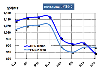 부타디엔(Butadiene)은 폭락세로 전환됐다. 부타디엔 가격은 6월17일 FOB Korea 톤당 940달러로 보합세를 형성했으나 CFR SE Asia는 860달러로 60달러 폭락했다. CFR China도 905달러로 60달러 폭락했다. 표, 그래프 : < Butadiene 가격추이> <화학저널 2016/06/21> |