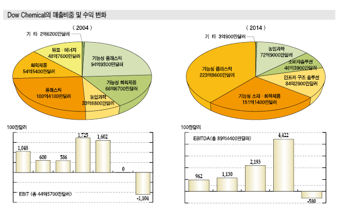 Dow Chemical은 현재 농업과학, 전자 및 기능성 소재, 기능성 플래스틱 등 Lilly, Rohm & Haas로부터 인수한 사업과의 시너지 추구에 경원자원 배분을 우선시하는 한편 화학제품 및 기능성 소재 등의 재배치와 철수를 추진하고 있다.