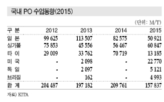 일본산 PO 수입은 2012년 9만9625톤, 2013년 11만3507톤에서 2014년 8만2575톤, 2015년 5만921톤으로 줄었고 2016년에는 5000톤 안팎에 불과할 것으로 예상되고 있다.