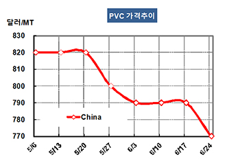 PVC(Polyvinyl Chloride)는 다시 하락세를 시작했다. PVC 가격은 6월22일 CFR China 톤당 770달러로 20달러 하락했고 CFR SE Asia 역시 760달러로 20달러 떨어졌다. CFR India도 835달러로 20달러 하락했다. 표, 그래프 : < PVC 가격추이 > <화학저널 2016/06/28> |