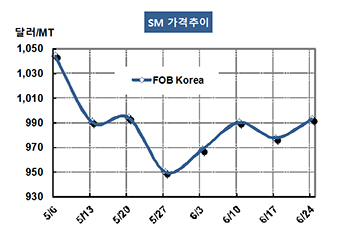 SM(Styrene Monomer)은 다시 1000달러에 육박했다. SM 가격은 6월24일 FOB Korea 톤당 993달러로 15달러 상승했고 CFR SE Asia 역시 1031달러로 14달러 올랐다. CFR India는 14달러 상승했으나 1027달러에 머물렀다. 표, 그래프 : < SM 가격추이 > <화학저널 2016/06/29> |