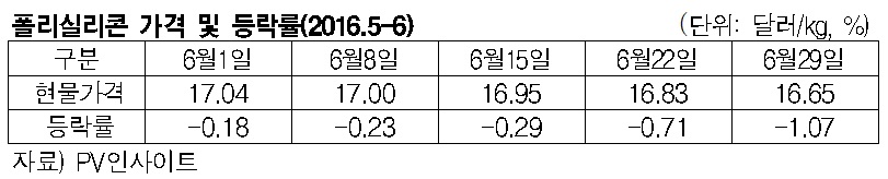 폴리실리콘(Polysilicon) 가격이 6주 연속 떨어지며 하락폭이 점차 확대되고 있다. 표, 그래프: <폴리실리콘 가격 및 등락률> <화학저널 2016/06/30> |