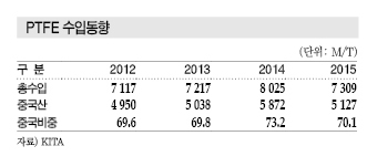 PTFE 수입량은 2012년 7117톤, 2013년 7217톤, 2014년 8025톤으로 증가세를 계속했으나 2015년에는 7309톤으로 8.9% 감소했다.