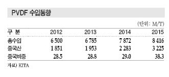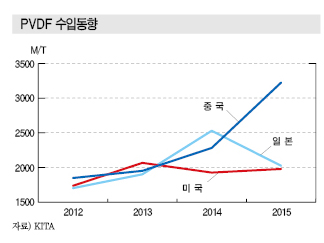 PVDF는 중국, 일본, 미국산을 주로 수입하고 있으며 수입량은 2012년 6500톤에서 2013년 6785톤, 2014년 7872톤, 2015년 8416톤으로 증가했다.