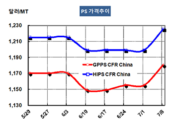 PS(Polystyrene)는 장기 보합세를 벗어나고 있다. GPPS(General Purpose PS) 가격은 7월6일 CFR China 톤당 1180달러로 25달러 상승했고 CFR SE Asia는 1205달러로 15달러 올랐다. 표, 그래프 : < PS 가격추이 > <화학저널 2016/07/13> |