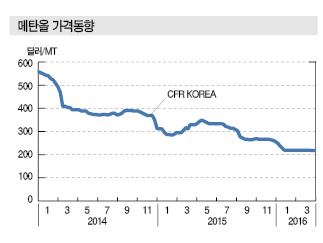 메탄올 가격은 2014년 초 550달러에서 2014년 말 310달러 수준까지 떨어졌으며 2015년에는 일부 플랜트가 가동중단해 4-5월 330달러 수준을 회복했으나 2015년 말 다시 230달러까지 떨어졌다.