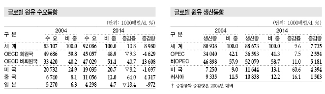 글로벌 원유 수요는 2014년 1일 9209만배럴로 2004년에 비해 10.8% 증가한 것으로 나타났다.