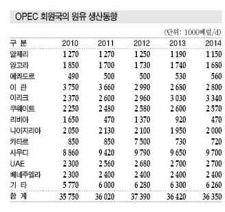 OPEC 생산량은 2013년 3642만배럴로 전년대비 2.6% 감소한데 이어 2014년에도 5월 전년동월대비 2.9% 줄어드는 등 감소세가 지속됐으나 9월에는 2.3% 늘어나며 증가로 전환됐다. 2015년에도 6월 4.9% 증가하는 등 증가세가 지속됐다.