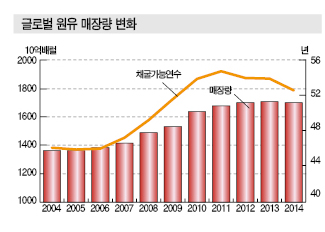 글로벌 원유 매장량은 2014년 1조7000억배럴로 당시 생산량인 8867만3000배럴로 나누면 채굴가능연수가 52.5년으로 계산돼 2011년 채굴가능연수 54.7년에 비해 크게 짧아졌다.
