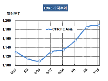 LDPE(Low-Density Polyethylene)는 초강세 행진을 지속하고 있다. LDPE 가격은 7월13일 CFR FE Asia 톤당 1190달러로 5달러 상승했고 CFR SE Asia도 1210달러로 5달러 올랐다. 표, 그래프 : < LDPE 가격추이 > <화학저널 2016/07/18> |