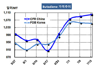 부타디엔(Butadiene)은 합성고무 강세에도 하락했다. 부타디엔 가격은 7월15일 FOB Korea 톤당 1052달러로 3달러 하락했으나 CFR SE Asia은 1055달러로 10달러 상승했다. CFR China 역시 1100달러로 10달러 올랐다. 표, 그래프 : < Butadiene 가격추이> <화학저널 2016/07/19> |