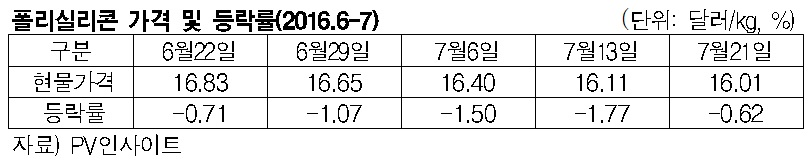 폴리실리콘 가격은 2016년 2월17일 등락률이 플러스로 전환된 후 14주 연속 상승하며 17달러를 돌파했으나 6월1일 하락세로 반전된 후 9주 연속 떨어졌다.