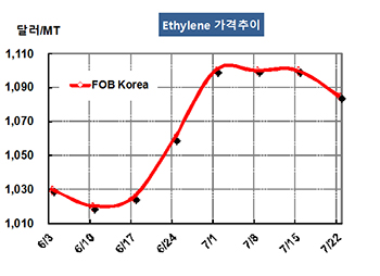 에틸렌(Ethylene)은 드디어 하락세를 시작했다. 에틸렌 가격은 7월22일 FOB Korea 톤당 1085달러로 15달러 하락했고 CFR SE Asia 역시 1060달러로 25달러 떨어졌다. CFR FE Asia는 1120달러로 15달러 하락했다. 표, 그래프 : < Ethylene 가격추이 > <화학저널 2016/07/25> |