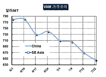 VAM 가격은 타이완 Dairen Chemical이 Mailiao 소재 VAM 65만톤 플랜트를 9월부터 최소 1달 동안 정기보수를 계획하고 있어 폭락세를 면하고 있다.