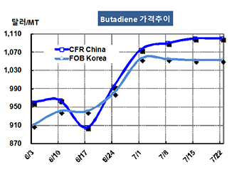 부타디엔(Butadiene)은 초강세 현상이 장기화되고 있다. 부타디엔 가격은 7월22일 FOB Korea 톤당 1052달러로 보합세를 형성했고 CFR SE Asia도 1055달러로 변동이 없었다. CFR China 역시 1100달러를 유지했다. 표, 그래프 : < Butadiene 가격추이> <화학저널 2016/07/27> |