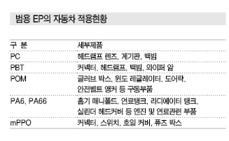 EP(Engineering Plastic)는 자동차용 경량소재로 부상하고 있으나 경쟁이 치열해지면서 강도를 높이는 등 차별성 확보가 필수적으로 요구된다.