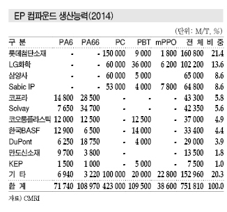 PBT는 2014년 기준 수지 가격이 전년대비 10.7% 하락한 반면 컴파운드는 5.6%만 떨어졌고 PA66도 수지가 11.8% 하락한 반면 컴파운드는 2% 떨어지는데 그쳐 kg당 스프레드가 각각 1421원, 1287원으로 EP 가운데 가장 높게 나타났다.