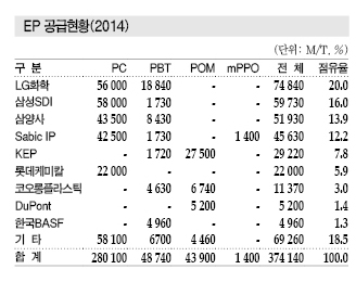 EP 수지 그레이드 수요는 2014년 기준 PC 34만6000톤으로 전체의 60% 정도를 차지하고 PBT 6만5200톤, PA66 6만4400톤, POM 6만800톤, PA6 3만8500톤, mPPO 7000톤 순으로 나타나고 있다.