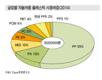 자동차용 합성수지 시장은 2014년 기준 802만톤으로 PP (Polypropylene) 440만톤, PA(Polyamide) 108만톤, ABS (Acrylonitrile Butadiene Styrene) 82만톤, PE(Polyethylene) 52만톤, PC(Polycarbonate) 37만톤, POM(Polyacetal) 33만톤, PBT(Polybutylene Terephthalate) 32만톤 등으로 파악되고 있다.