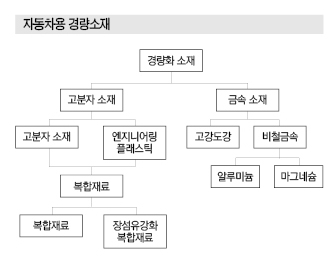 자동차는 고장력 강판, 알루미늄, 마그네슘, CFRP 등 신소재를 적용함으로써 철강소재 대비 10-50% 수준까지 중량을 줄일 수 있는 것으로 파악되고 있다.